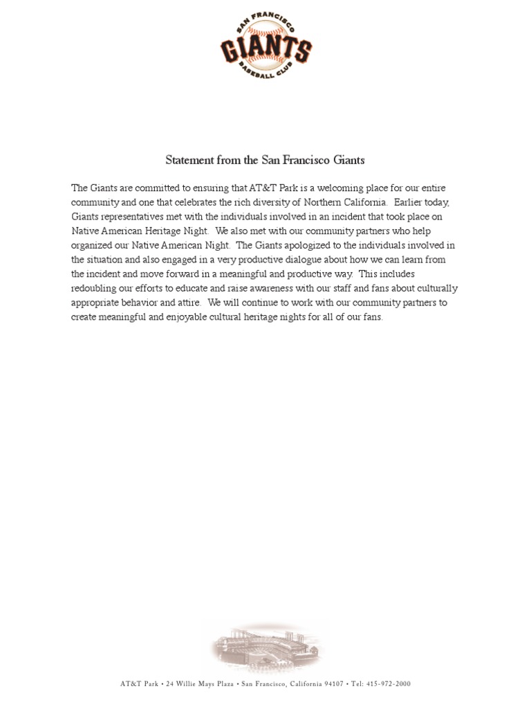 Statement From The San Francisco Giants Regarding Recent Headdress Incident