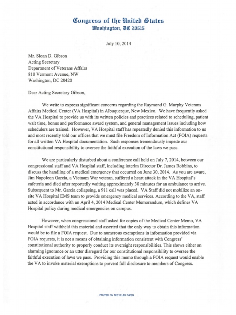 Members of the New Mexico Congressional Delegation send a letter to VA Secretary Gibson to express significant concerns regarding the Raymond G. Murphy Veterans Affairs Medical Center (VA Hospital) in Albuquerque, New Mexico.