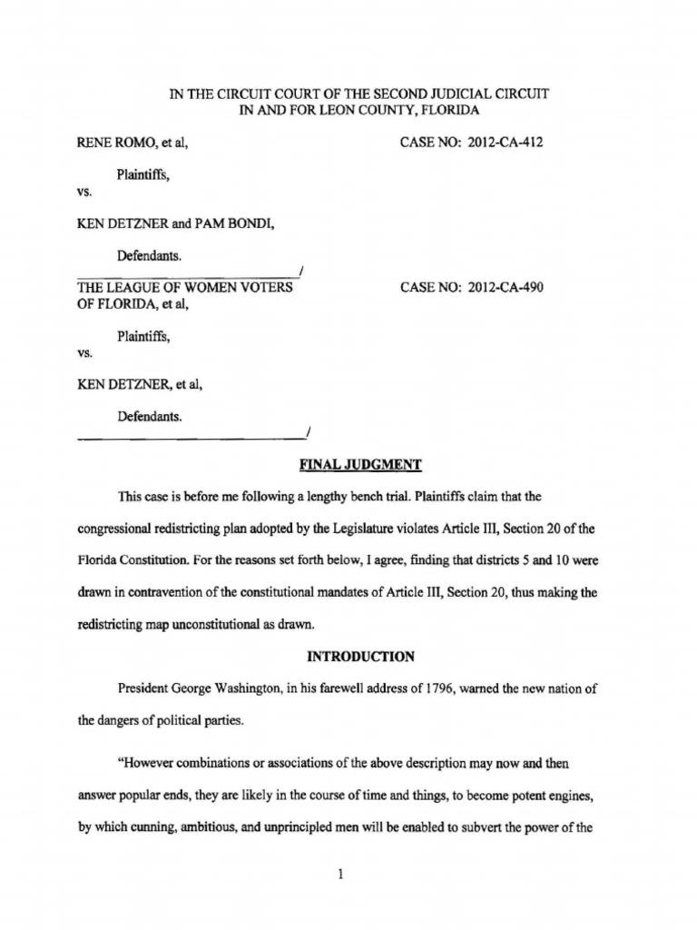 RENE ROMO, et al, Plaintiffs, vs. KENDETZNER and PAM BONDI, Defendants. / THE LEAGUE OF WOMEN VOTERS OF FLORIDA, et al, Plaintiffs, vs. KENDETZNER, et al, Defendants. ------------_./ CASE NO: 2012-CA-412 CASE NO: 2012-CA-490 FINAL JUDGMENT This case is before me following a lengthy bench trial . Plaintiffs claim that the congressional redistricting plan adopted by the Legislature violates Article III, Section 20 of the Florida Constitution. For the reasons set forth below, I agree, finding that districts 5 and 10 were drawn in contravention ofthe constitutional mandates of Article III, Section 20, thus making the redistricting map unconstitutional as drawn. INTRODUCTION President George Washington, in his farewell address of I 796, warned the new nation of the dangers of political parties. "However combinations or associations of the above description may now and then answer popular ends, they are likely in the course of time and things, to become potent engines, by which cunning, ambitious, and unprincipled men will be enabled to subvert the power of the I people andto usurp for themselves the reins of government, destroyingafterwards the very engines which have lifted them to unjust dominion....Without looking forward to an extremityof this kind (which nevertheless ought not to be entirely out of sight), the commonand continual mischiefs ofthe spirit of party are sufficient to make it the interest and duty of a wise people to discourage and restrain it." His countrymendid not heed Washington's warningand quickly divided themselves into opposingpolitical factions. Though the names have changedover the years, the two major political parties have been battlingeach other for control over our nation's govenunent ever since. To many, it seems that Washington's fears have been realized. Certain in the rightnessof their cause, of the superiorityoftheir ideas and their members, they consider those in the opposingcampto be not only wrong, but a threat to the very foundations of our country. Any idea of the other party is to be opposed fervently. They must win elections and gain or remain in powerbecause, to the partisans, their party's interest is synonymous with the country's interest. In short, winning is everything. One of the ways in which political parties seek to gain or maintainan advantageover the other is throughthe redistricting process. Every ten years, based on newcensus data, congressional seats are reapportioned amongthe states based upon shiftingpopulationfigures. To many citizens this process is of mild interest, but to the political parties it is a high stakes proposition, a zero sum game in whichone party wins and the other loses - for years to come. Subtleshifts in a district boundary line can make the differencebetween a district that is "safe" for a political party or one that is "competitive" betweenthe two. It can make a big differencein the ability to recruit candidates for particulardistricts, the amount of time, energy and resources 2 necessary to give a party's candidate a real chance of success, and ultimately, whether the party can maintain a majority of seats in congress. Historically, the political party in control ofthe state legislature has been able to draw the new districts in a manner that protects their party and its incumbents. Voter populations are shifted and clustered based upon how they are likely to vote. The result has often been maps with districts that have unusual boundaries and bizarre shapes, as if some abstract artist had been given free rein. This practice has come to be called pol itical gerrymandering and has been criticized as allowing, in effect, the representatives to choose their voters instead of vice versa. In 20 I0, the voters of Florida passed two amendments to the Florida Constitution, commonly referred to as the Fair Districts Amendments, aimed at eliminating such political gerrymandering. These amendments are now codified in the Constitution as Article III Section 20, pertaining to congressional redistricting and Article III Section 21, pertaining to state legislative redistricting. These amendments significantly decrease the Legislature's discretion in drawing district boundaries. Specifically forbidden is the drawing of a redistricting plan with the intent to favor or disfavor a political party or incumbent. Section 20 reads as follows: Standards for establishing congressional district boundaries.-In establishing congressional district boundaries: (a)No apportionment plan or individual district shall be drawn with the intent to favor or disfavor a political party or an incumbent; and districts shall not be drawn with the intent or result of denying or abridging the equal opportunity ofracial or language minorities to participate in the political process or to diminish their ability to elect representatives oftheir choice; and districts shall consist of contiguous territory. (b)Unless compliance with the standards in this subsection conflicts with the standards in subsection I (a) or with federal law, districts shall be as nearly equal in population as is practicable; districts shall be compact; and districts shall , where feasible, utilize existing political and geographical boundaries. 3 (c)The order in which the standards within subsections l(a) and (b) ofthis section are set forth shall not be read to establish any priority of one standard over the other within that subsection. Art . 1Il, 20, Fla. Const. Subsection (a) contains tier-one requirements which must be followed. In addition to prohibiting intent to favor or disfavor a political party or incumbent, this subsection contains two distinct protections for racial and language minorities. The first, which prohibits districts which are drawn with "the intent or result of denying or abridging the equal opportunity ofracial or language minorities to participate in the political process," is similar to Section II to of the Voting Rights Act. Commonly referred to as the "vote di