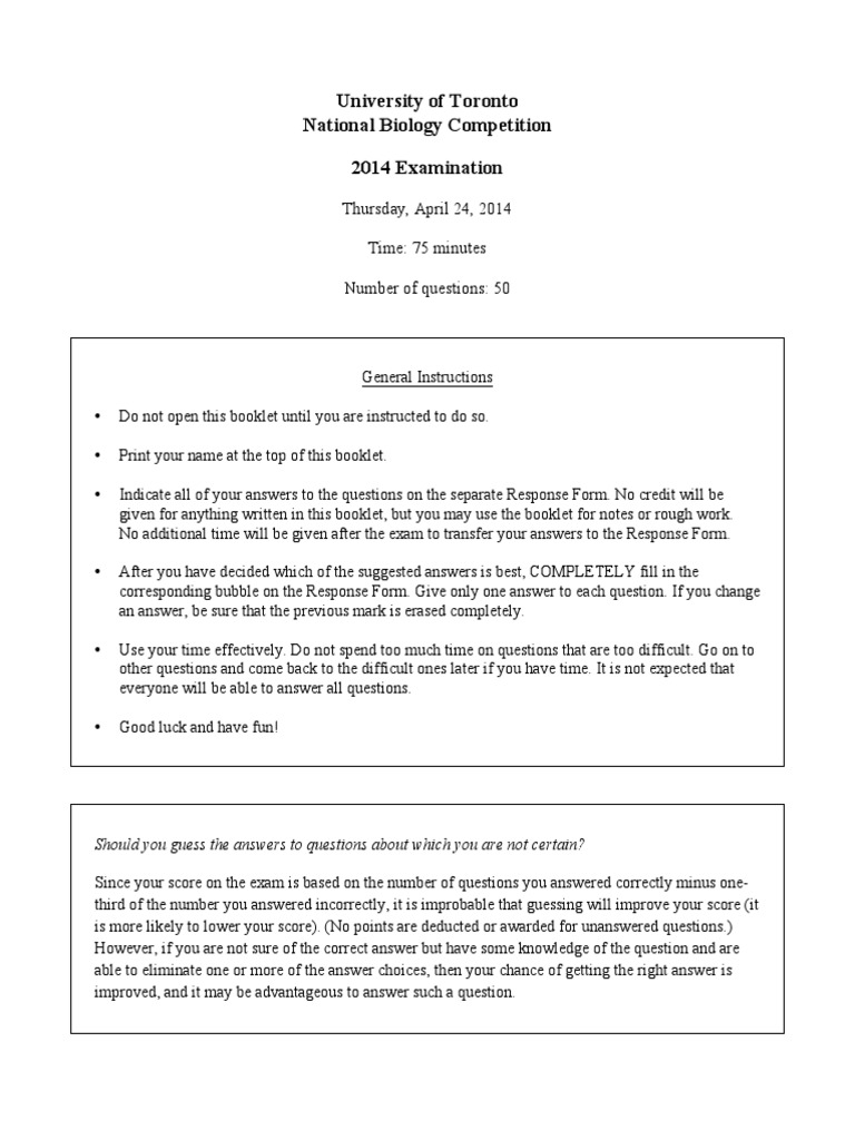 No additional time will be given after the exam to transfer your answers to the Response Form.