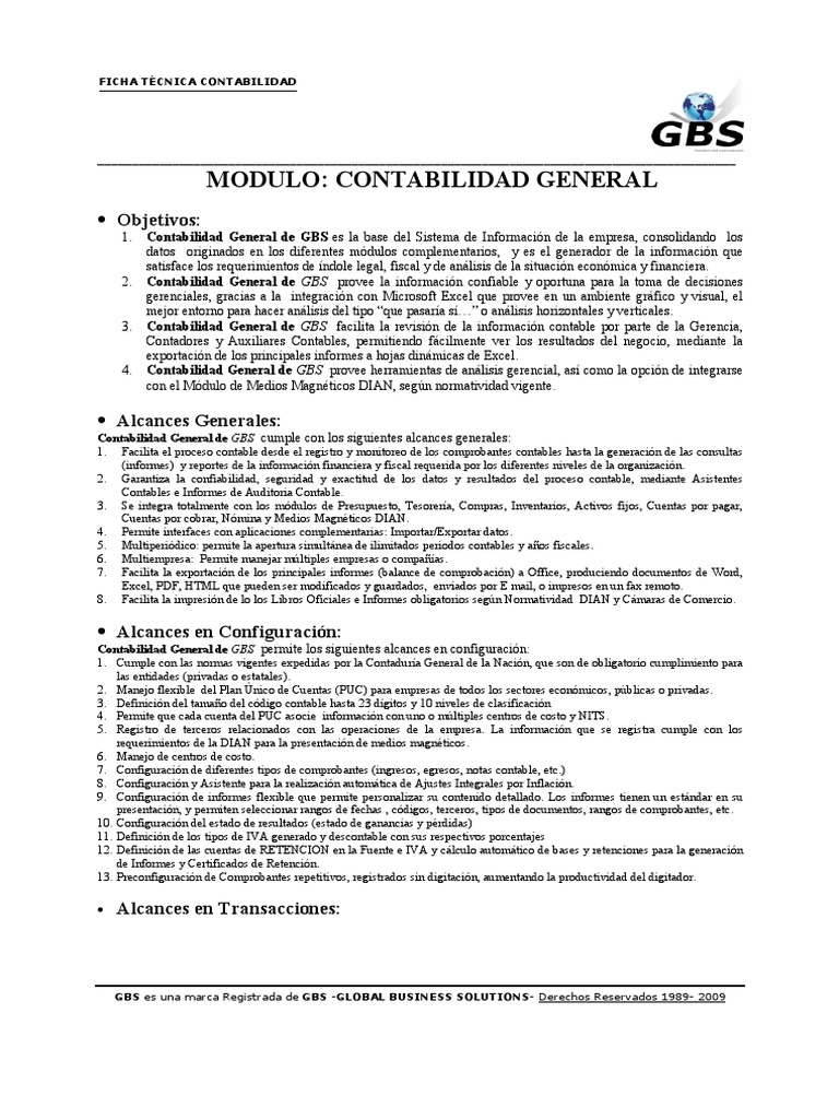 Contabilidad General de GBS cumple con los siguientes alcances generales: