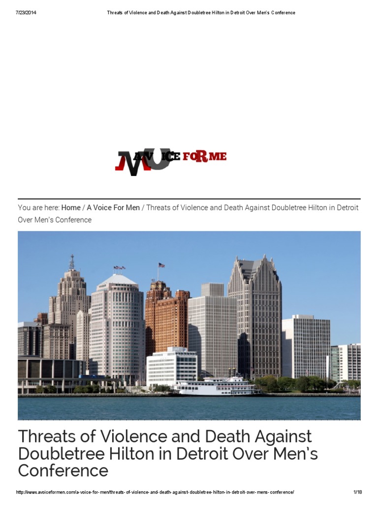 http://www.avoiceformen.com/a-voice-for-men/threats-of-violence-and-death-against-doubletree-hilton-in-detroit-over-mens-conference/ 1/18