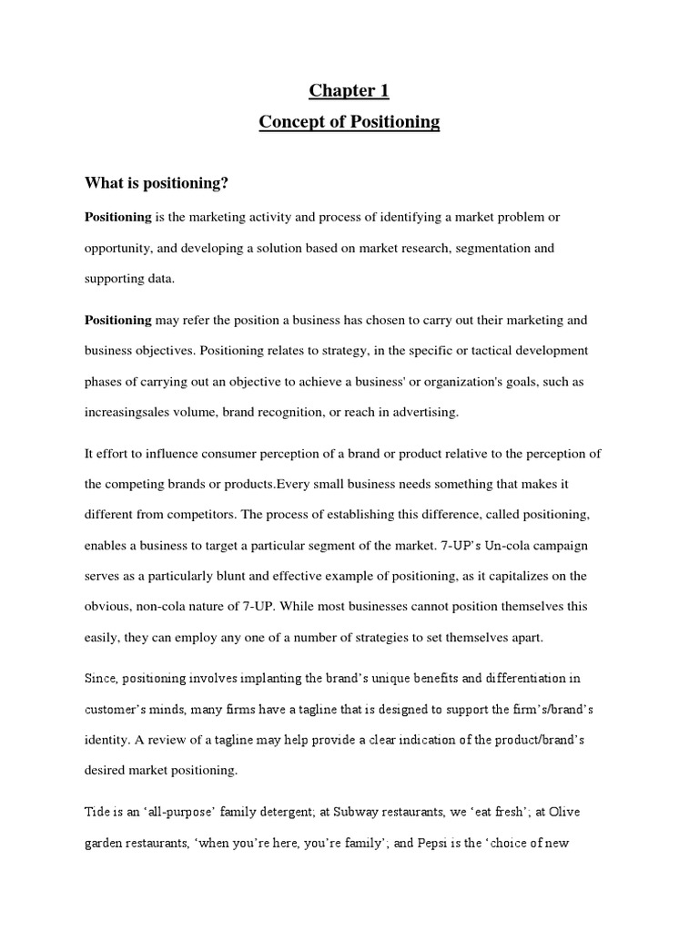 unique identity. Positioning may refer the position a business has chosen to carry out their