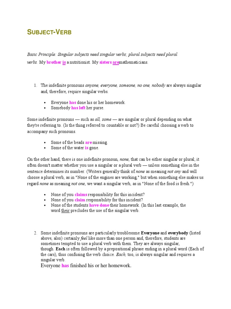 Basic Principle: Singular subjects need singular verbs; plural subjects need plural