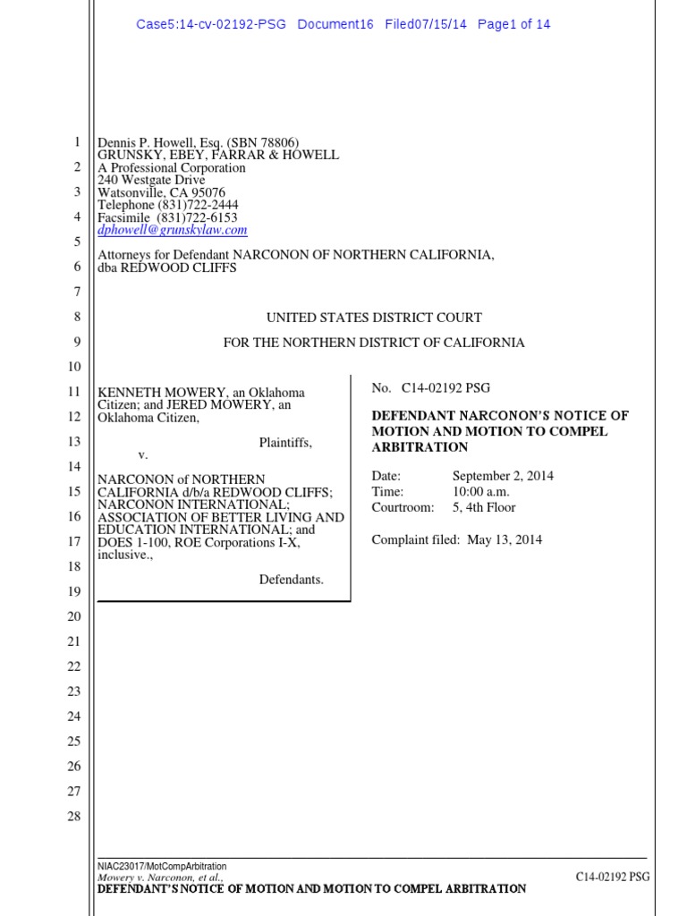 Attorneys for Defendant NARCONON OF NORTHERN CALIFORNIA, dba REDWOOD CLIFFS UNITED STATES DISTRICT COURT FOR THE NORTHERN DISTRICT OF CALIFORNIA KENNETH MOWERY, an Oklahoma Citizen; and JERED MOWERY, an Oklahoma Citizen, Plaintiffs, v. NARCONON of NORTHERN CALIFORNIA d/b/a REDWOOD CLIFFS; NARCONON INTERNATIONAL; ASSOCIATION OF BETTER LIVING AND EDUCATION INTERNATIONAL; and DOES 1-100, ROE Corporations I-X, inclusive., Defendants.