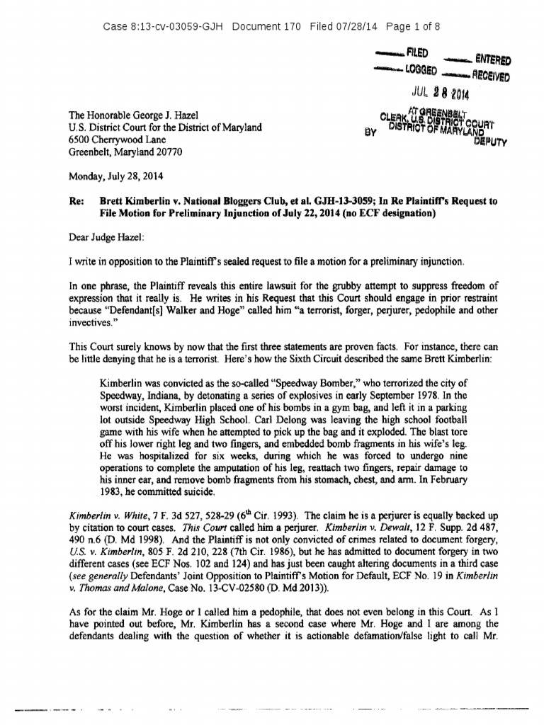 Re: Brett Kimberlin v. National Bloggers Club, et al. GJH-I3-3059; In Re Plaintiff's Request to