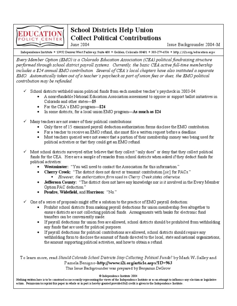 To learn more, read Should Colorado School Districts Stop Collecting Political Funds? by Mark W. Salley and