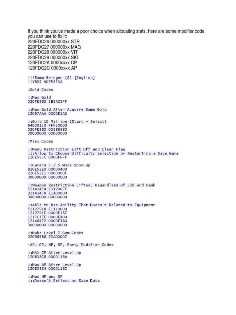 If you think you've made a poor choice when allocating stats, here are some modifier code