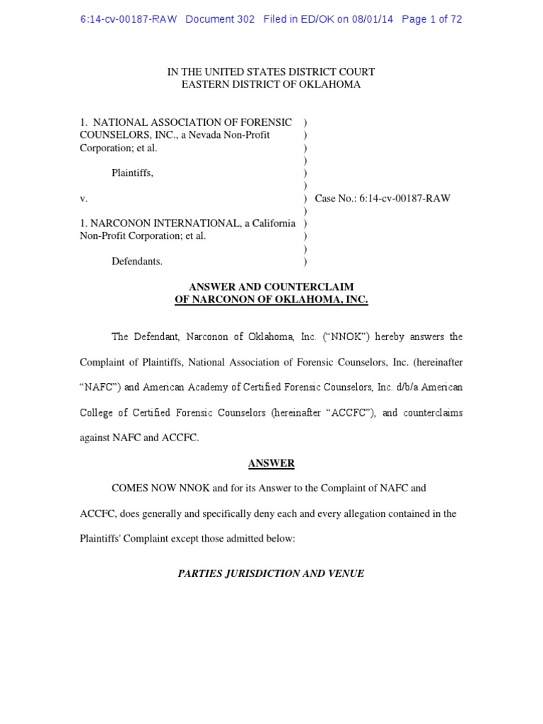 IN THE UNITED STATES DISTRICT COURT EASTERN DISTRICT OF OKLAHOMA 1. NATIONAL ASSOCIATION OF FORENSIC ) COUNSELORS, INC., a Nevada Non-Profit ) Corporation; et al. ) ) Plaintiffs, ) ) v. ) Case No.: 6:14-cv-00187-RAW ) 1. NARCONON INTERNATIONAL, a California ) Non-Profit Corporation; et al. ) ) Defendants. )