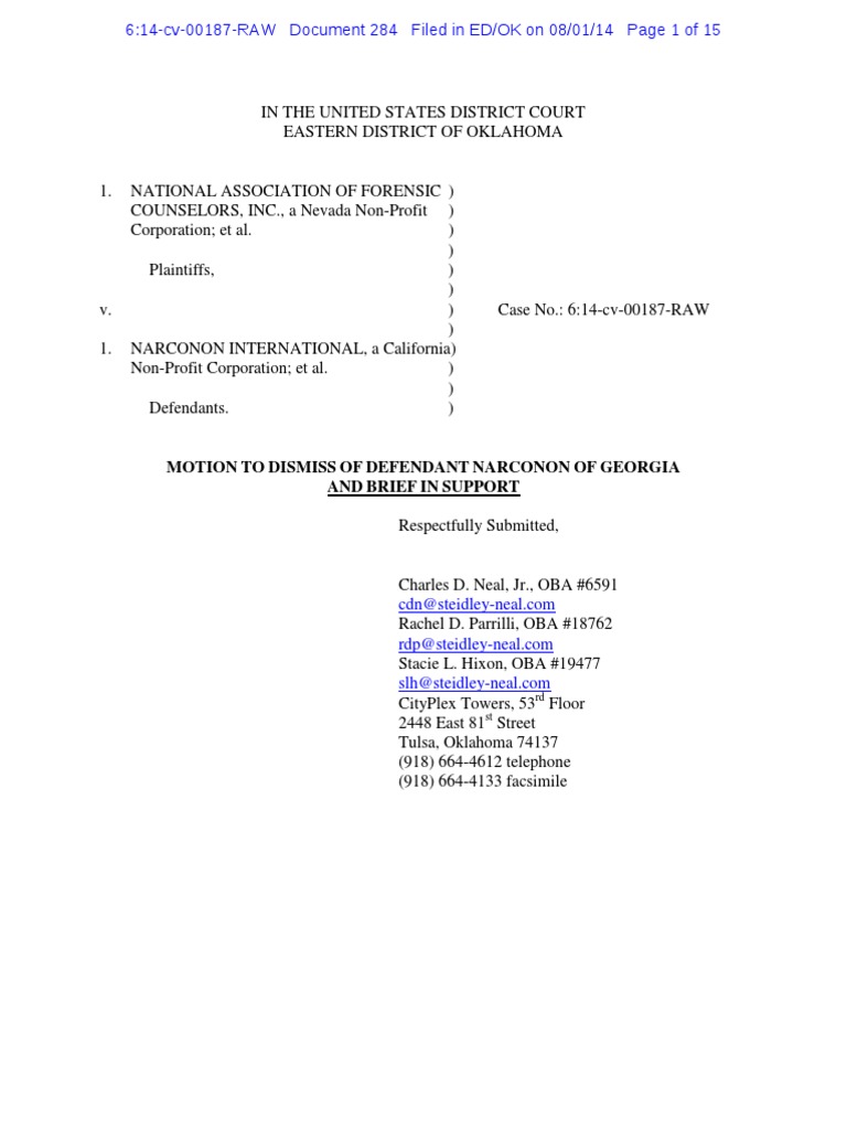 IN THE UNITED STATES DISTRICT COURT EASTERN DISTRICT OF OKLAHOMA 1. NATIONAL ASSOCIATION OF FORENSIC ) COUNSELORS, INC., a Nevada Non-Profit ) Corporation; et al. ) ) Plaintiffs, ) ) v. ) Case No.: 6:14-cv-00187-RAW ) 1. NARCONON INTERNATIONAL, a California) Non-Profit Corporation; et al. ) ) Defendants. )