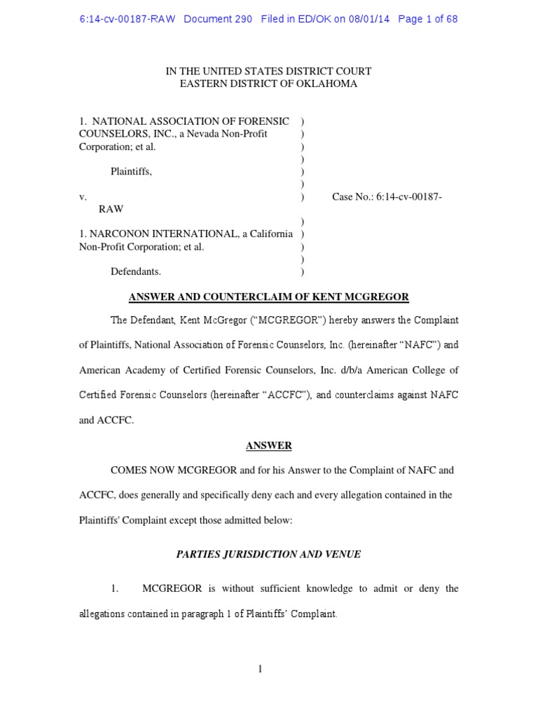1 IN THE UNITED STATES DISTRICT COURT EASTERN DISTRICT OF OKLAHOMA 1. NATIONAL ASSOCIATION OF FORENSIC ) COUNSELORS, INC., a Nevada Non-Profit ) Corporation; et al. ) ) Plaintiffs, ) ) v. ) Case No.: 6:14-cv-00187-RAW ) 1. NARCONON INTERNATIONAL, a California ) Non-Profit Corporation; et al. ) ) Defendants. )