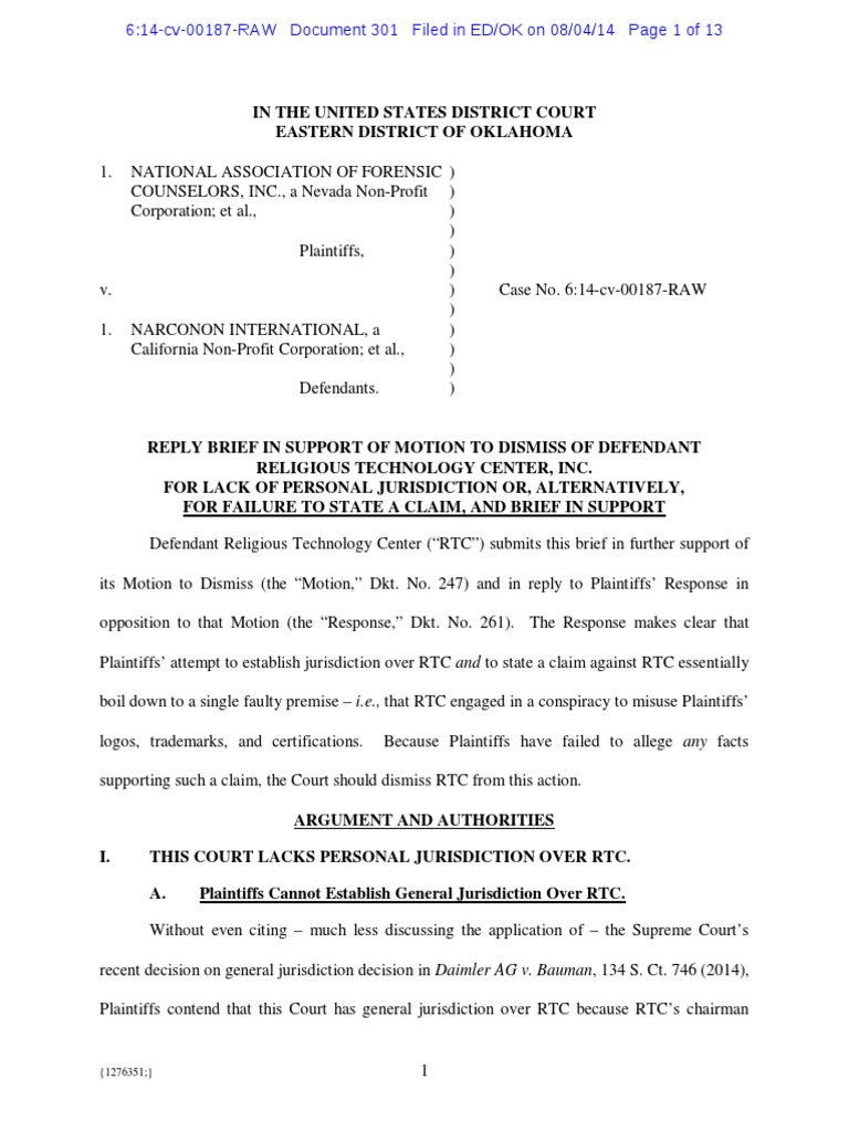 REPLY BRIEF IN SUPPORT OF MOTION TO DISMISS OF DEFENDANT RELIGIOUS TECHNOLOGY CENTER, INC. FOR LACK OF PERSONAL JURISDICTION OR, ALTERNATIVELY, FOR FAILURE TO STATE A CLAIM, AND BRIEF IN SUPPORT
