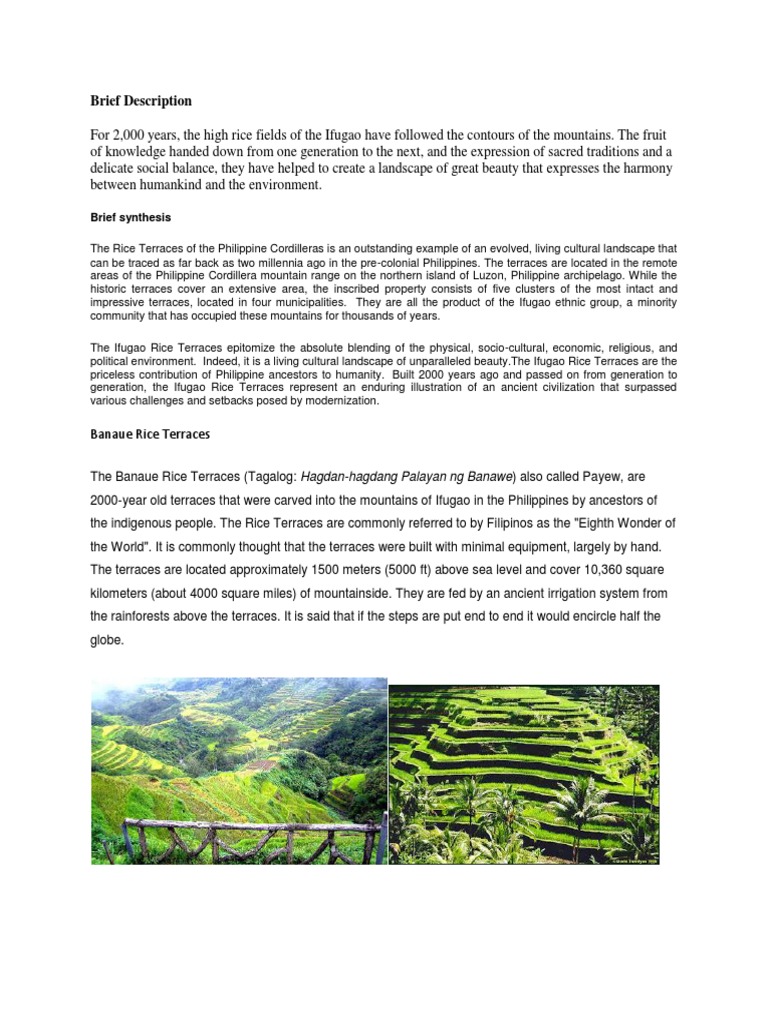 political environment. Indeed, it is a living cultural landscape of unparalleled beauty.The Ifugao Rice Terraces are the