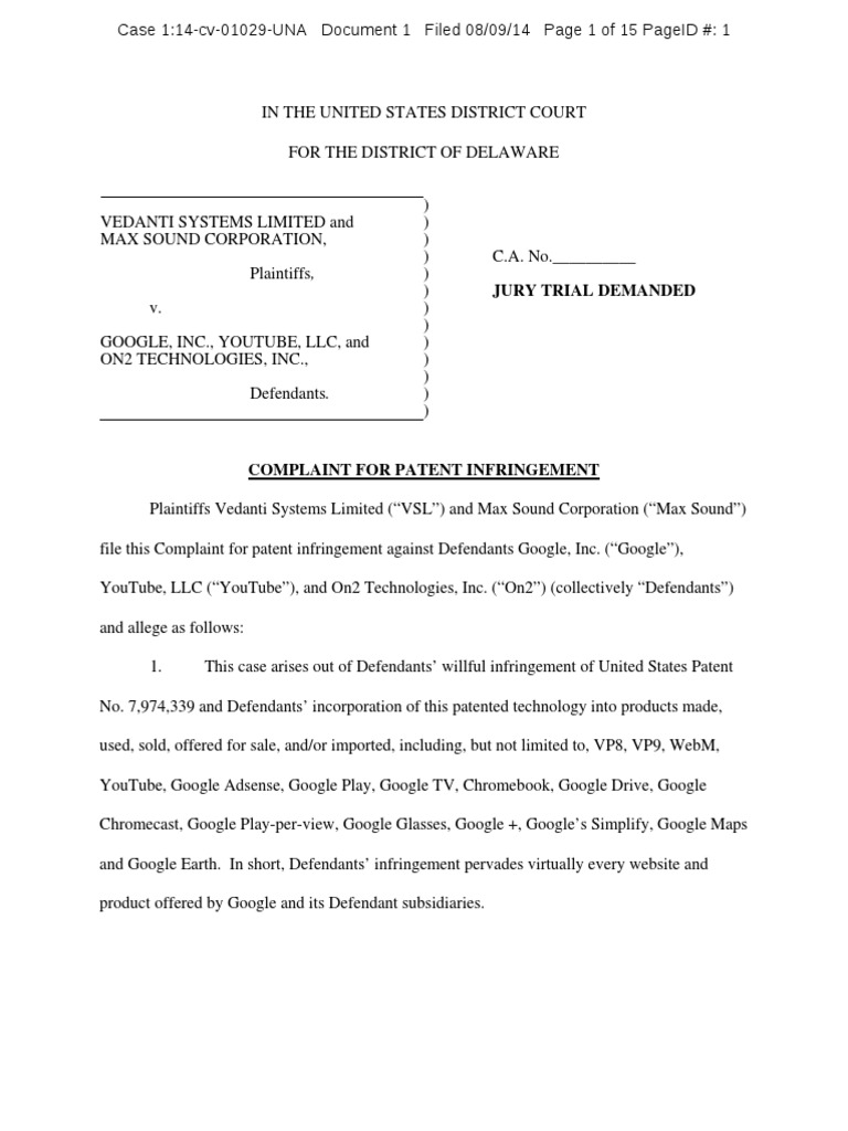 Plaintiffs Vedanti Systems Limited (“VSL”) and Max Sound Corporation (“Max Sound”) file this Complaint for patent infringement against Defendants Google, Inc. (“Google”), YouTube, LLC (“YouTube”), and On2 Technologies, Inc. (“On2”) (collectively “Defendants”) and allege as follows: