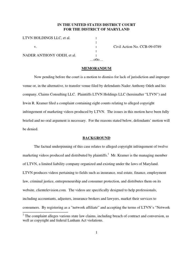 infringement of marketing videos produced by LTVN. The issues in this motion have been fully