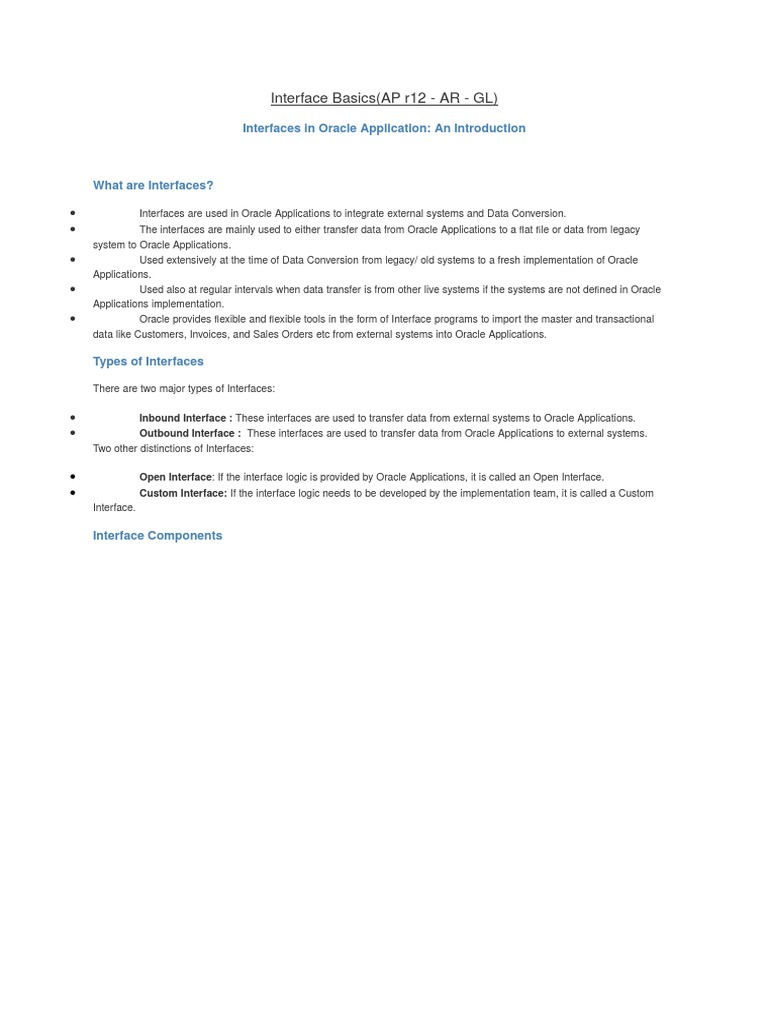 The interfaces are mainly used to either transfer data from Oracle Applications to a fat fle or data from legacy