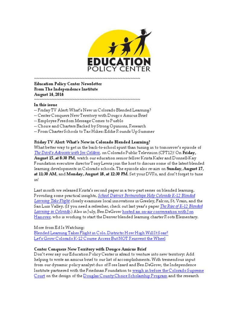 From The Independence Institute August 14, 2014 ~~~~~~~~~~~~~~~~~~~~~~~~~~~~~~~~~~~~~~~~~~ In this issue -- Friday TV Alert: Whats New in Colorado Blended Learning? -- Center Conquers New Territory with Dougco Amicus Brief -- Employee Freedom Message Comes to Pueblo -- Choice and Charters Backed by Strong Opinions, Research -- From Charter Schools to Tax Hikes: Eddie Rounds Up Summer