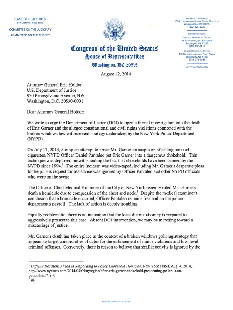 Congressman Jeffries and five members of Congress (Representatives Charles B. Rangel, Yvette D. Clarke, Gregory W. Meeks, Nydia M. Velázquez & Jose E. Serrano) have formally asked Attorney General Eric Holder to investigate the circumstances surrounding the death of Eric Garner at the hands of the NYPD. The letter also questions the validity of the NYPD's broken windows policing strategy.