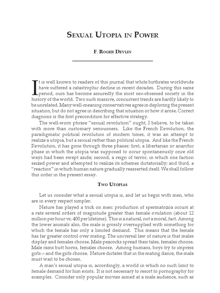 t is well known to readers of this journal that white birthrates worldwidehave suffered a catastrophic decline in recent decades. During this sameperiod, ours has become assuredly the most sex-obsessed society in theistory of the world. Two such massive, concurrent trends are hardly likely toe unrelated. Many well-meaning conservatives agree in deploring the presentsituation, but do not agree in describing that situation or how it arose. Correctdiagnosis is the first precondition for effective strategy.The well-worn phrase “sexual revolution” ought, I believe, to be takenith more than customary seriousness. Like the French Revolution, thearadigmatic political revolution of modern times, it was an attempt toealize a utopia, but a sexual rather than political utopia. And like the Frenchevolution, it has gone through three phases: first, a libertarian or anarchichase in which the utopia was supposed to occur spontaneously once oldays had been swept aside; second, a reign of terror, in which one factionseized power and attempted to realize its schemes dictatorially; and third, a“reaction” in which human nature gradually reasserted itself. We shall followthis order in the present essay.