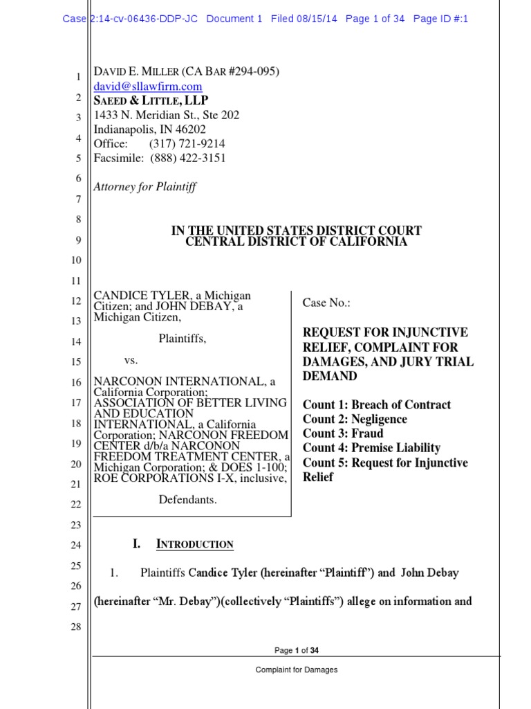 CANDICE TYLER, a Mcgan Citizen; and JOHN DEBAY, a Michigan Citizen, Plaintiffs, vs. ARCONON INTERNATIONAL, a California Corporation; ASSOCIATION OF BETTER LIVING AND EDUCATION INTERNATIONAL, a California Corporation; NARCONON FREEDOM CENTER d/b/a NARCONON FREEDOM TREATMENT CENTER, a Michigan Corporation; & DOES 1-100; ROE CORPORATIONS I-X, inclusive, Defendants. Case No.: