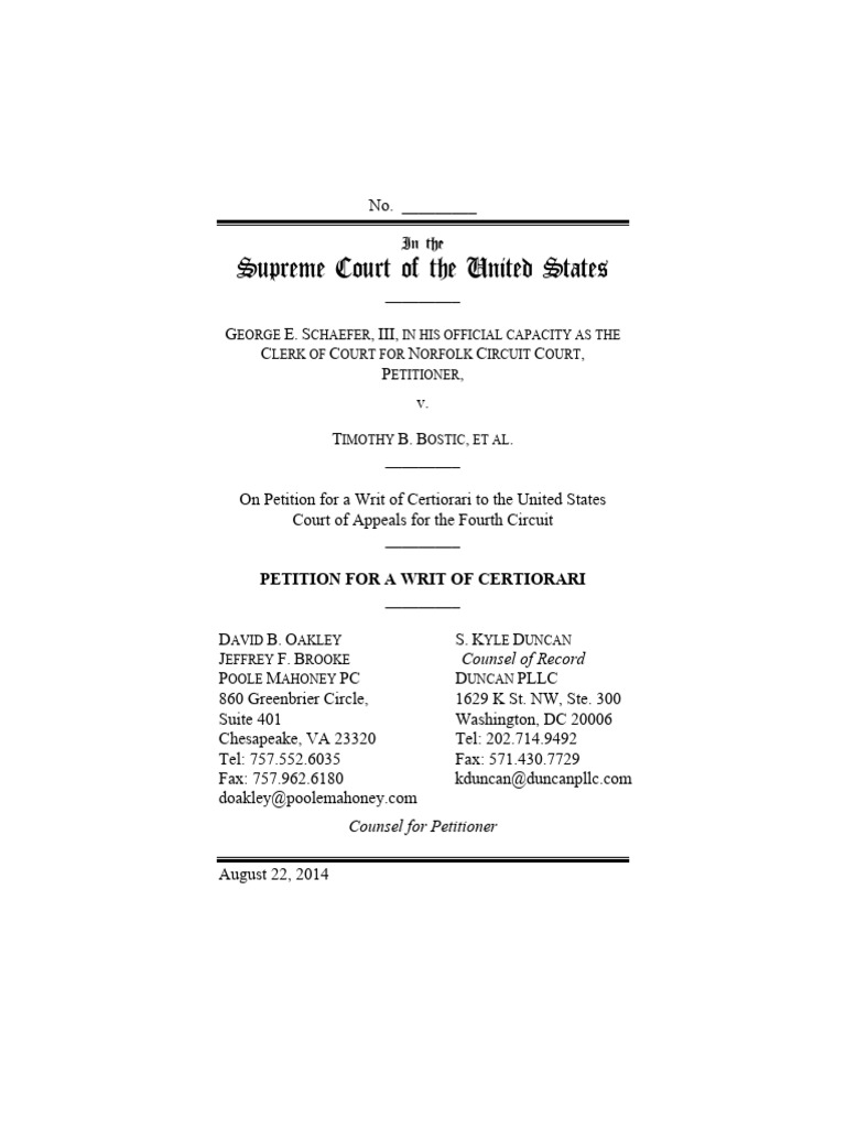Petitioner George E. Schaefer, III, in his official capacity as the Clerk of the Circuit Court of the City of Norfolk, Virginia, was a defendant in the district court and an appellant in the court of appeals. Respondents Timothy B. Bostic, Tony C. London, Carol Schall, and Mary Townley were plaintiffs in the district court and appellees in the court of appeals. Respondents Joanne Harris, Christy Berghoff, Victoria Kidd, and Jessica Duff, class-action plaintiffs in
