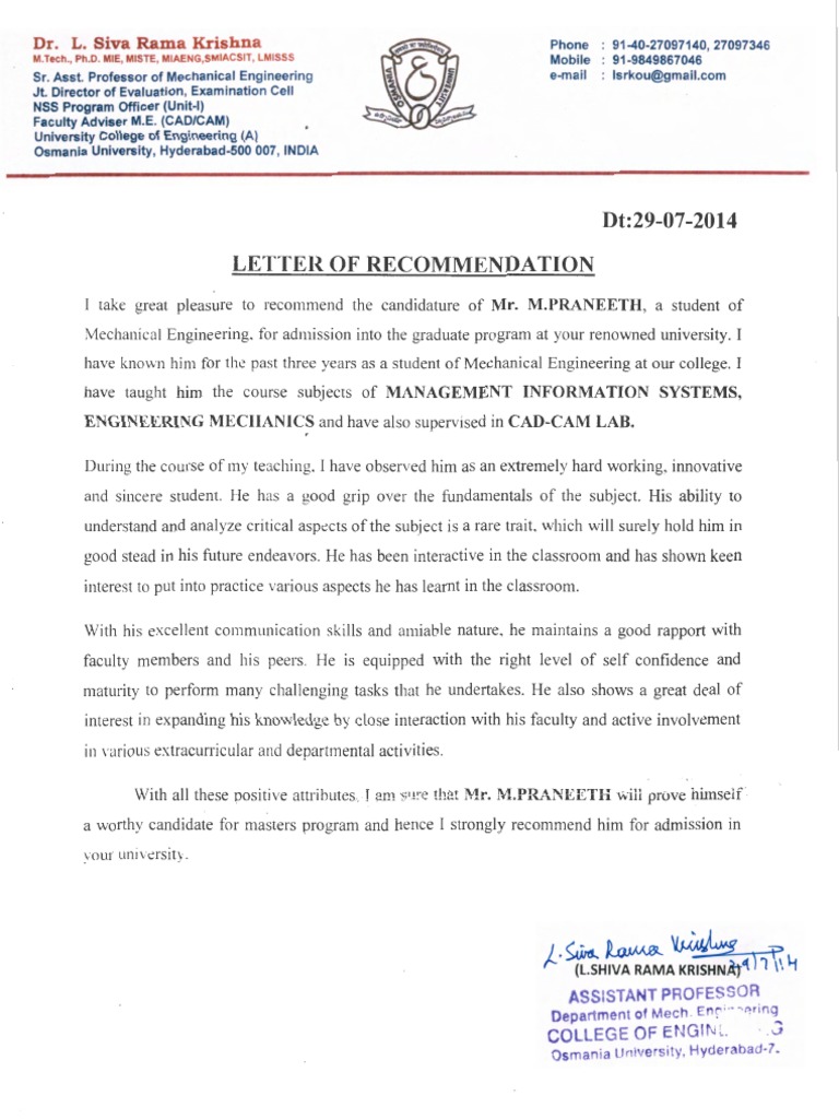 have known him for the past three years as a student of Mechanical Engineering at our college. I
