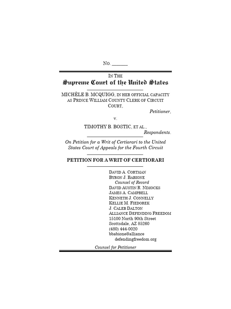 Petitioner Michèle B. McQuigg, in her official capacity as Prince William County Clerk of Circuit Court, was an intervenor-defendant in the district court and an appellant in the court of appeals. Respondents Timothy B. Bostic, Tony C. London, Carol Schall, and Mary Townley were the plaintiffs in the district court and appellees in the court of appeals. Respondents Joanne Harris, Jessica Duff, Christy Berghoff, and Victoria Kidd—class-action plaintiffs in