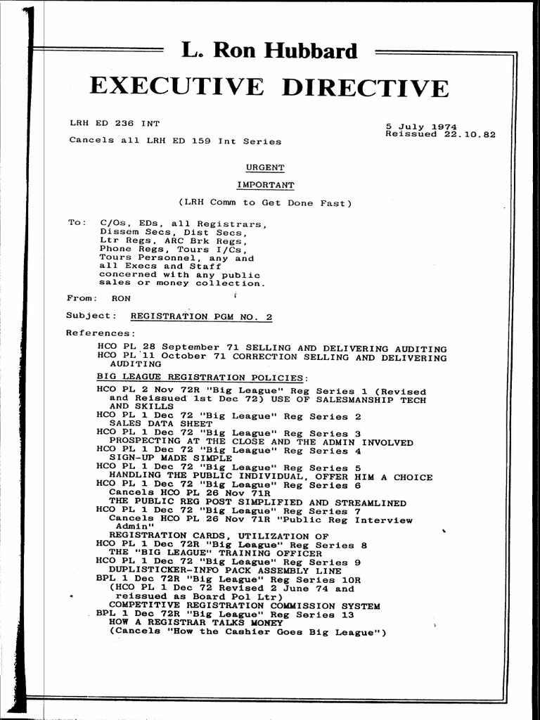 Scientology's Executive Directive instructing its staff how to do the hard sell on members, 1974.