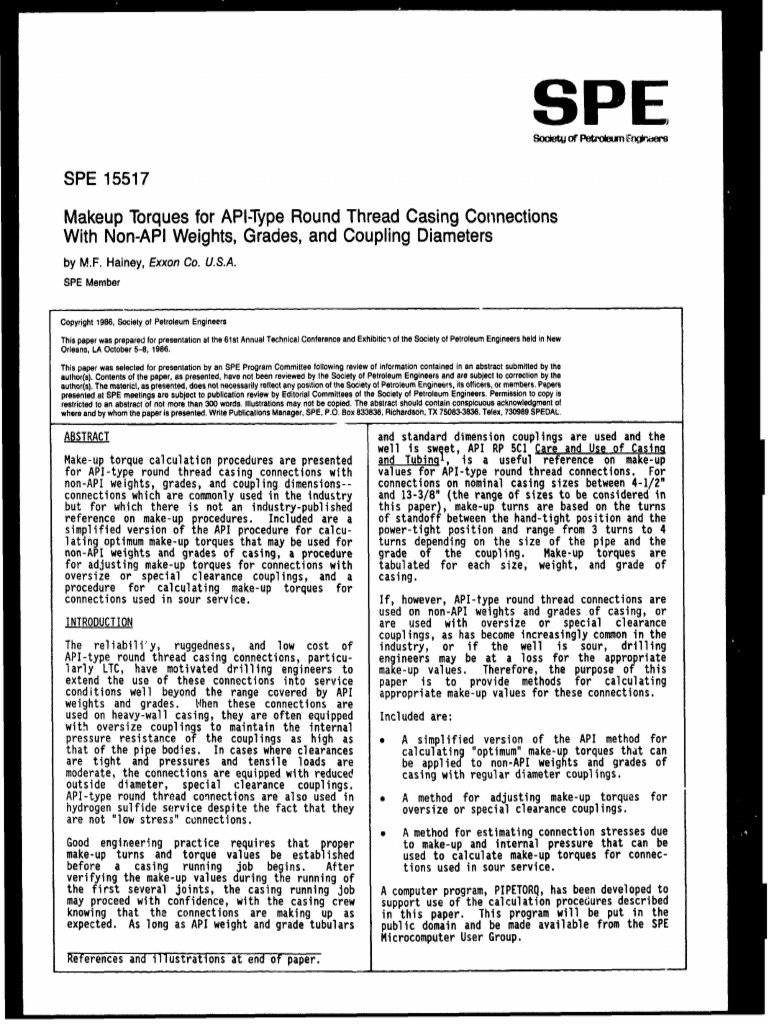 Makeup Torques for AP1-TypeRound Thread Casing Connections