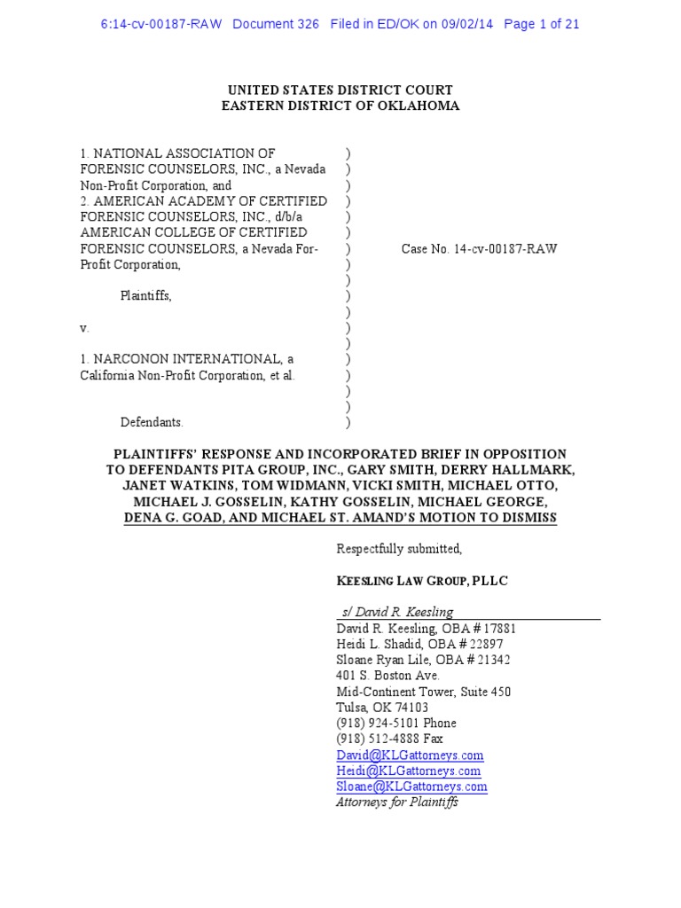 1. NATIONAL ASSOCIATION OF FORENSIC COUNSELORS, INC., a Nevada Non-Profit Corporation, and 2. AMERICAN ACADEMY OF CERTIFIED FORENSIC COUNSELORS, INC., d/b/a AMERICAN COLLEGE OF CERTIFIED FORENSIC COUNSELORS, a Nevada For-Profit Corporation, Plaintiffs, v. 1. NARCONON INTERNATIONAL, a California Non-Profit Corporation, et al. Defendants. )))))))))))))))))) Case No. 14-cv-00187-RAW