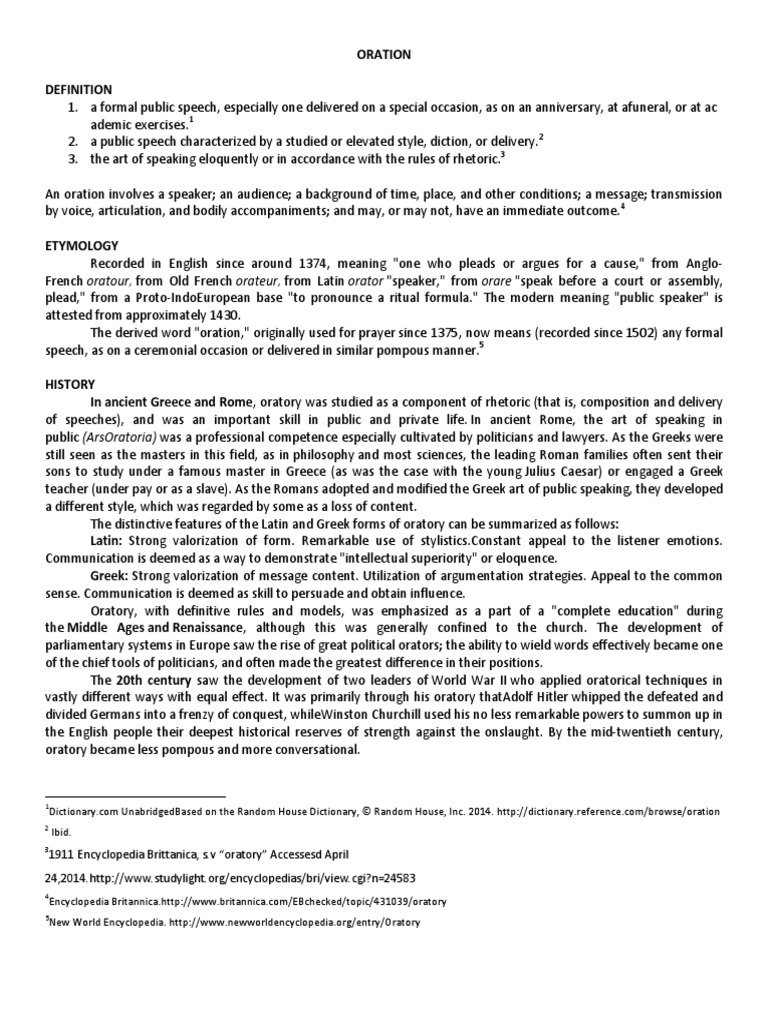 An oration involves a speaker; an audience; a background of time, place, and other conditions; a message; transmission