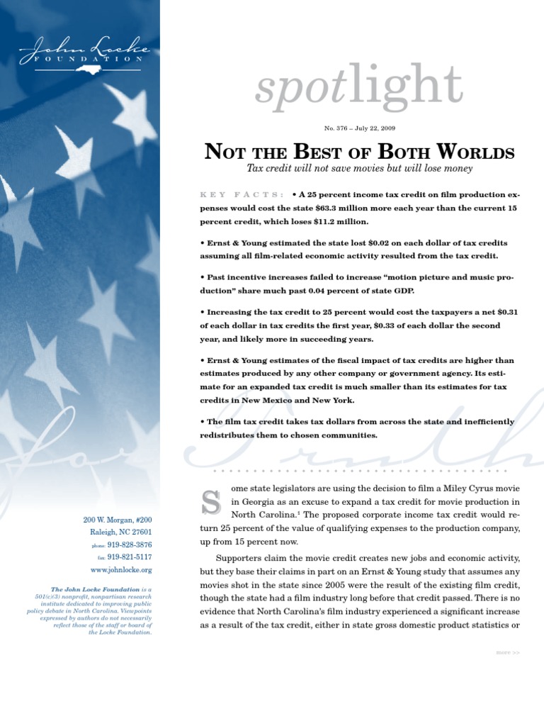 9. Mark Johnson, “Lawmakers push tax credit for movies,” The News & Observer (Raleigh), June 25, 2009, www.newsobserver.com/politics/