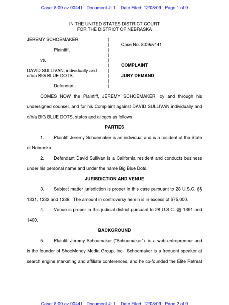 Case No. 8:09cv441 - Jeremy Schoemaker vs. David Sullivan d/b/a Big Blue Dots
