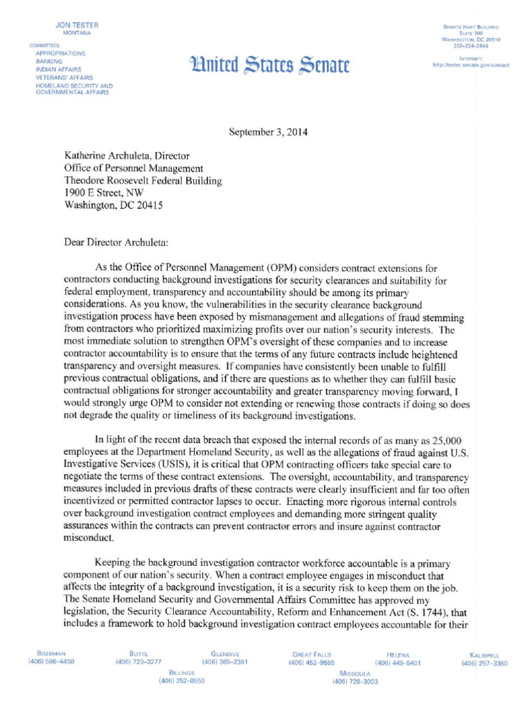 Senator Tester's letter to the Director of OPM re: background investigation contractors.