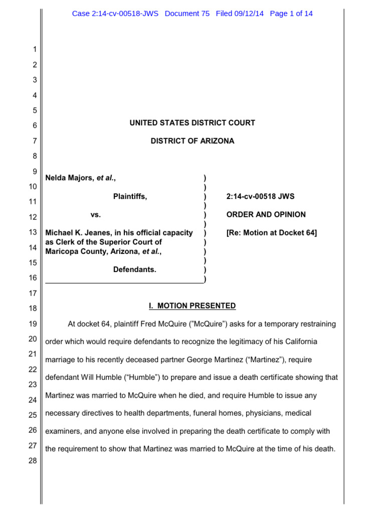 At docket 64, plaintiff Fred McQuire (”McQuire”) asks for a temporary restrainingorder which would require defendants to recognize the legitimacy of his Californiamarriage to his recently deceased partner George Martinez (“Martinez”), requiredefendant Will Humble (“Humble”) to prepare and issue a death certificate showing thatMartinez was married to McQuire when he died, and require Humble to issue anynecessary directives to health departments, funeral homes, physicians, medicalexaminers, and anyone else involved in preparing the death certificate to comply withthe requirement to show that Martinez was married to McQuire at the time of his death.