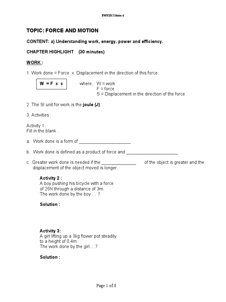 CONTENT: a) Understanding work, energy, power and efficiency.