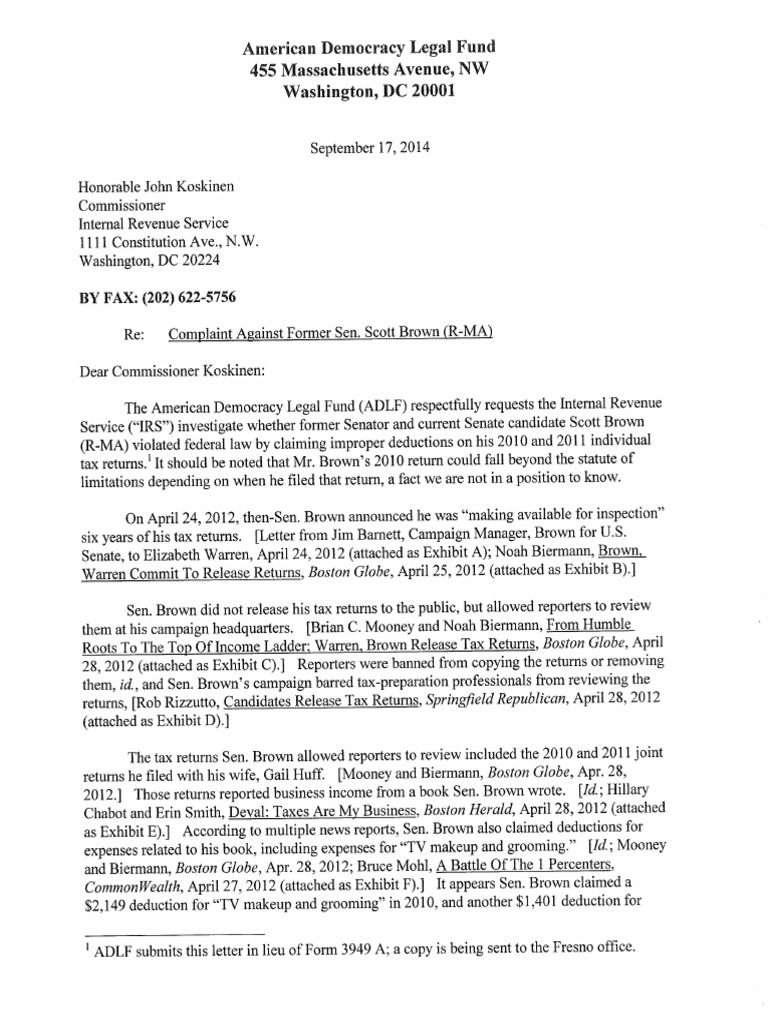 American Democracy Legal Fund - Scott Brown IRS Complaint