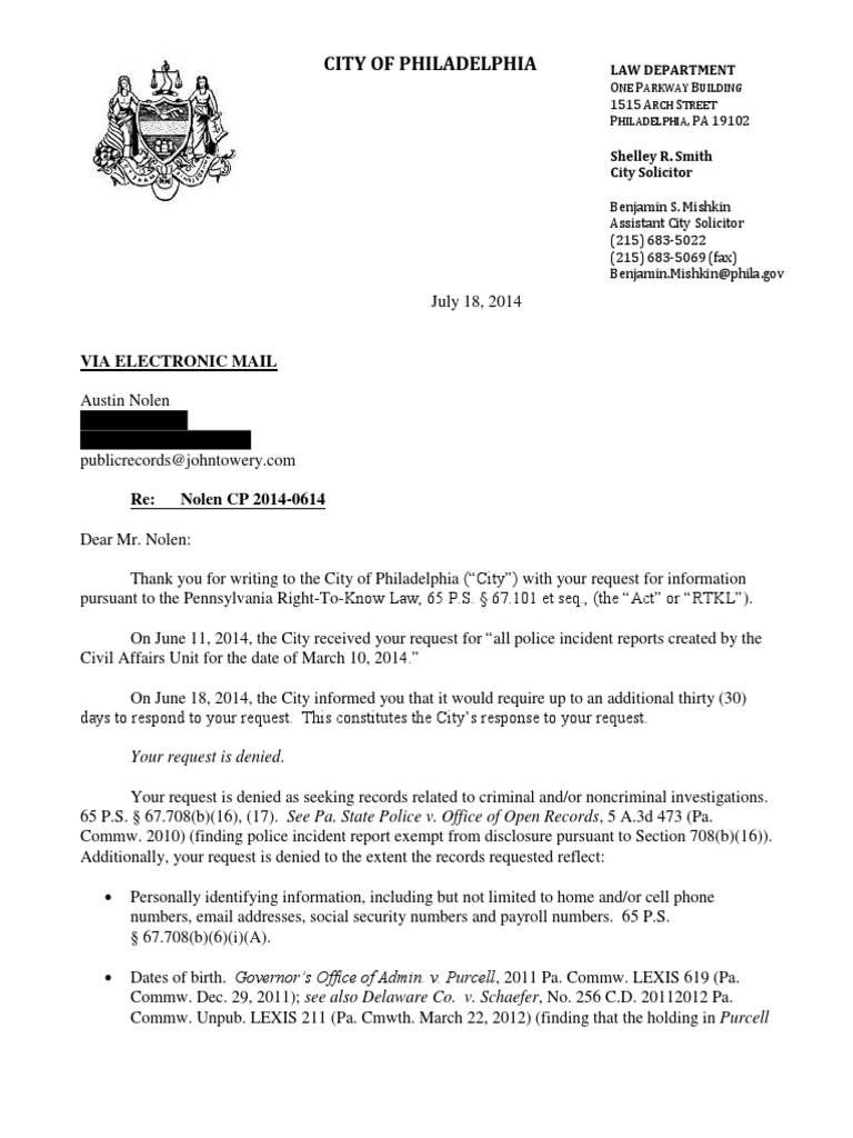 cc: Lt. Edward Egenlauf, Open Records Officer, Philadelphia Police Department