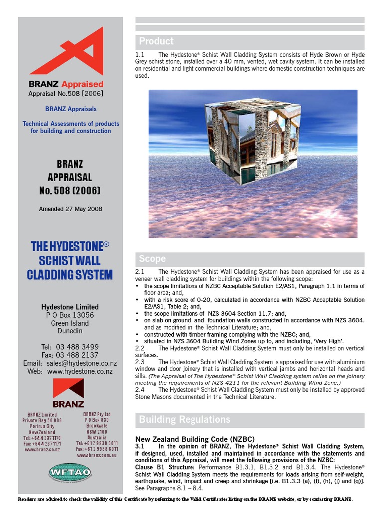 Schist Wall Cladding System meets the requirements for loads arising from self-weight,