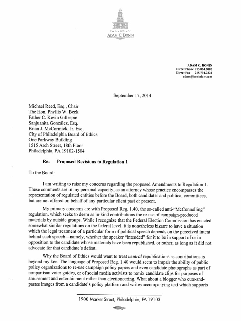 Written Testimony of Adam C. Bonin before the City of Philadelphia Board of Ethics, September 17, 2014, regarding the Board's proposed new anti-"McConnelling" regulations on the republication of campaign materials by outside groups.