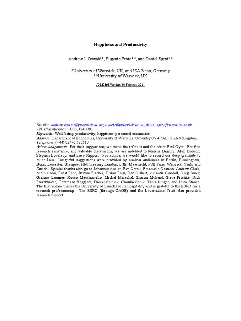 Keywords: Well-being; productivity; happiness; personnel economics.