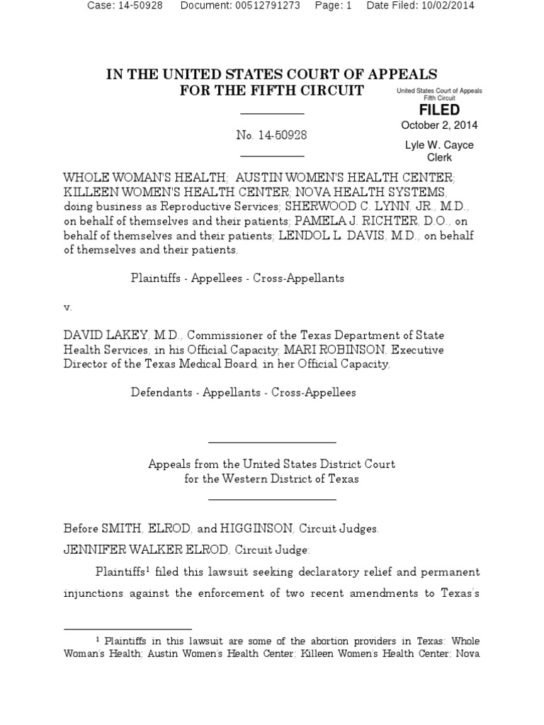 The lawsuit was filed in April 2014, and the district court conducted a four-day bench trial August 4–7, 2014. Three weeks later, at 4:39 p.m. on August 29, 2014, the last business day before the ambulatory surgical center provision would go into effect, the district court delivered its opinion and issued a final judgment enjoining the admitting privileges requirement and ambulatory surgical center provision of H.B. 2 as to all abortion facilities in Texas. The district court also enjoined other specific applications of H.B. 2. The district court opined that together these requirements “create a brutally effective system of abortion regulation” that is unconstitutional. Appellants (collectively “the State”) appealed to the Fifth Circuit and filed an emergency motion to stay the district court’s injunctions pending the resolution of their appeal. Plaintiffs filed a response, the State replied, and