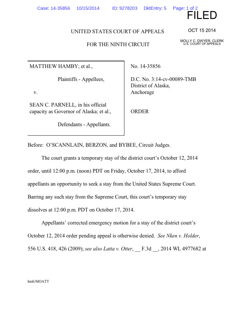 UNITED STATES COURT OF APPEALS FOR THE NINTH CIRCUITMATTHEW HAMBY; et al., Plaintiffs - Appellees, v.SEAN C. PARNELL, in his officialcapacity as Governor of Alaska; et al., Defendants - Appellants. No. 14-35856D.C. No. 3:14-cv-00089-TMBDistrict of Alaska, AnchorageORDER Before: O’SCANNLAIN, BERZON, and BYBEE, Circuit Judges.The court grants a temporary stay of the district court’s October 12, 2014order, until 12:00 p.m. (noon) PDT on Friday, October 17, 2014, to affordappellants an opportunity to seek a stay from the United States Supreme Court. Barring any such stay from the Supreme Court, this court’s temporary staydissolves at 12:00 p.m. PDT on October 17, 2014.Appellants’ corrected emergency motion for a stay of the district court’sOctober 12, 2014 order pending appeal is otherwise denied.