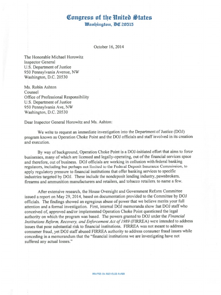 Led by Rep. Blaine Luetkemeyer, R-Mo., the 30 lawmakers sent a letter to Michael Horowitz, the Justice Department’s inspector general, and Robin Ashton, head of its Office of Professional Responsibility, calling Choke Point a “blatant abuse of legal authority.”