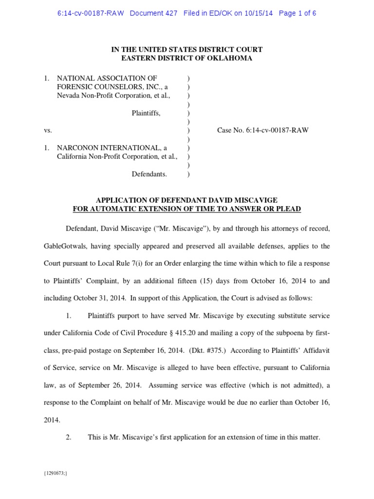 Defendant, David Miscavige (“Mr. Miscavige”), by and through his attorneys of record, GableGotwals, having specially appeared and preserved all available defenses, applies to the Court pursuant to Local Rule 7(i) for an Order enlarging the time within which to file a response to Plaintiffs’ Complaint, by an additional fifteen (15) days from October 16, 2014 to and including October 31, 2014. In support of this Application, the Court is advised as follows: 1.
