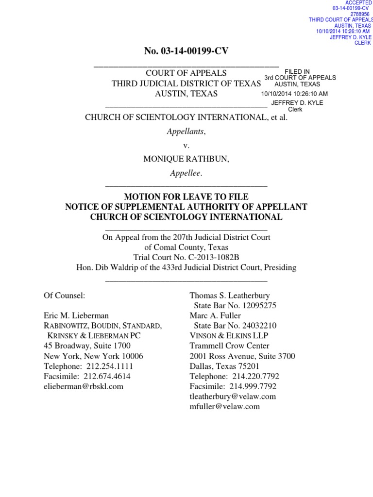 -1-TO THE HONORABLE COURT OF APPEALS:Appellant Church of Scientology International (“Church”) requests leave tofile a Notice of Supplemental Authority addressing two issues that arose at oralargument and a new decision of the Texas Court of Criminal Appeals.First, this Notice provides the citation for a case,
