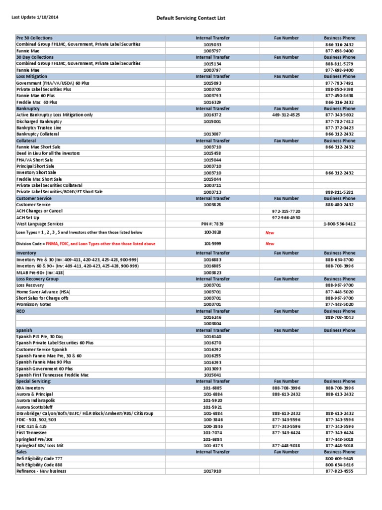 Default Servicing Contact List