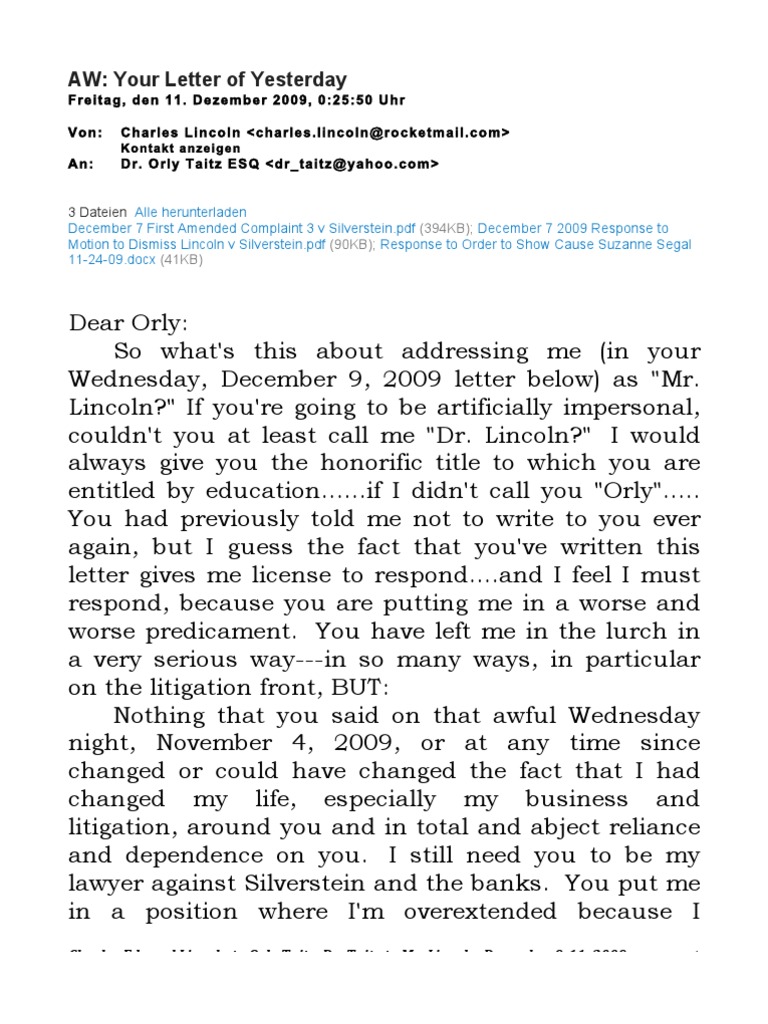 Dear Orly: So what's this about addressing me (in your Wednesday, December 9, 2009 letter below) as "Mr. Lincoln?" If you're going to be artificially impersonal, couldn't you at least call me "Dr. Lincoln?" I would always give you the honorific title to which you are entitled by education......if I didn't call you "Orly"..... You had previously told me not to write to you ever again, but I guess the fact that you've written this letter gives me license to respond....and I feel I must respond, because you are putting me in a worse and worse predicament. You have left me in the lurch in a very serious way---in so many ways, in particular on the litigation front, BUT: Nothing that you said on that awful Wednesday night, November 4, 2009, or at any time since changed or could have changed the fact that I had changed my life, especially my business and litigation, around you and in total and abject reliance and dependence on you. I still need you to be my lawyer against Silverstein and the banks. You put me in a position where I'm overextended because I