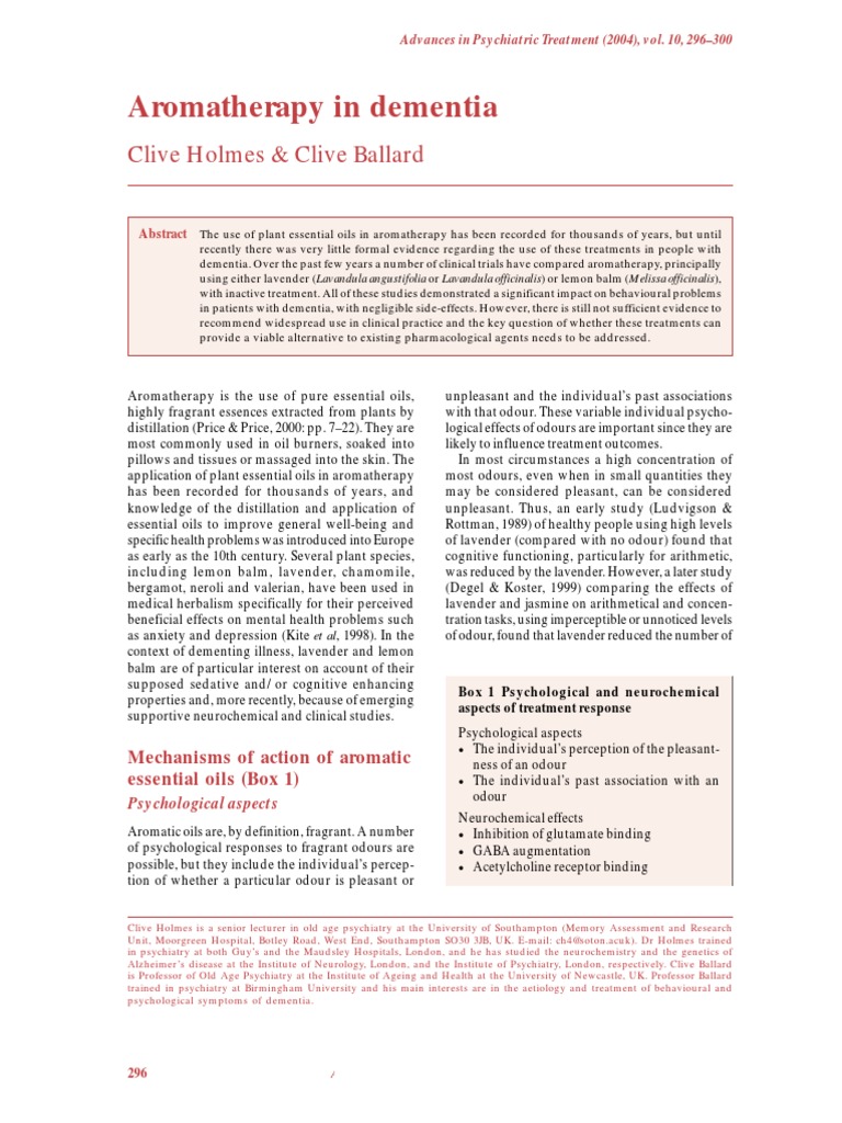 dementia. Over the past few years a number of clinical trials have compared aromatherapy, principally
