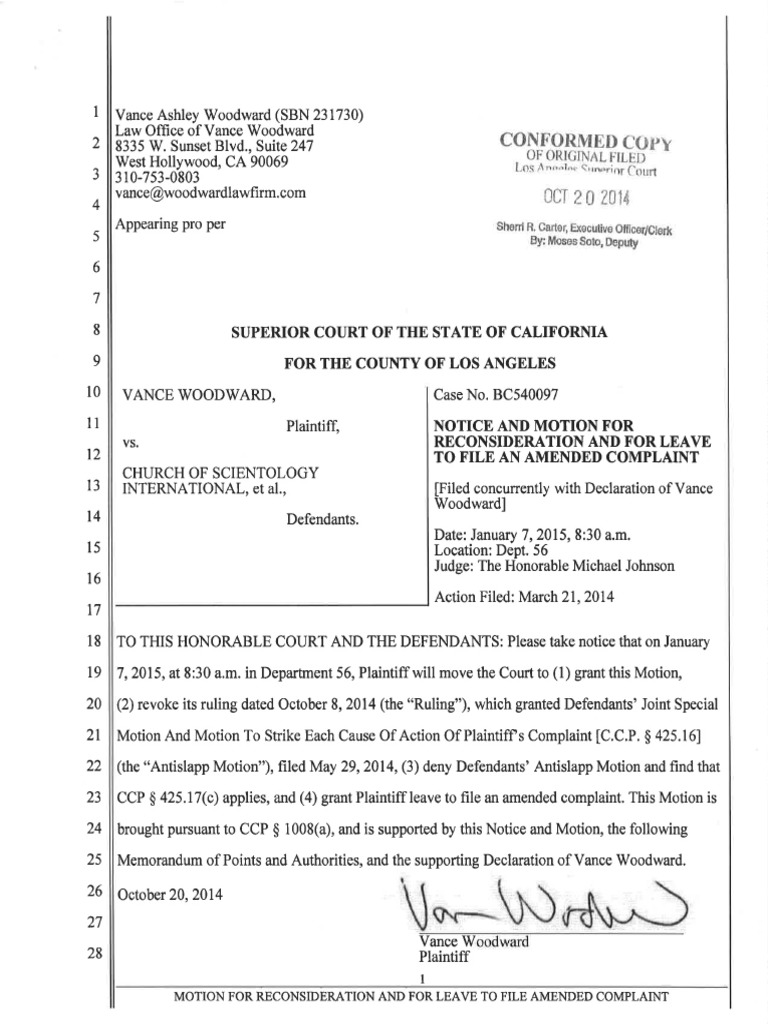 [Filed concurrently with Declaration of Vance Woodward] Defendants. Date: January 7, 2015, 8:30 a.m. Location: Dept. 56 Judge: The Honorable Michael Johnson TO THIS HONORABLE COURT AND THE DEFENDANTS: Please take notice that on January 7, 2015, at 8:30 a.m. in Department 56, Plaintiff will move the Court to (1) grant this Motion, (2) revoke its ruling dated October 8, 2014 (the Ruling ), which granted Defendants' Joint Special Motion And Motion To Strike Each Cause Of Action Of Plaintiff's Complaint [C.C.P. § 425.16] (the Antislapp Motion ), filed May 29, 2014, (3) deny Defendants' Antislapp Motion and find that CCP § 425.17(c) applies, and (4) grant Plaintiff leave to file an amended complaint. This Motion is brought pursuant to CCP § 1008(a), and is supported by this Notice and Motion, the following Memorandum of Points and Authorities, and the supporting Declaration of Vance Woodward. Vance Woodward Plaintiff